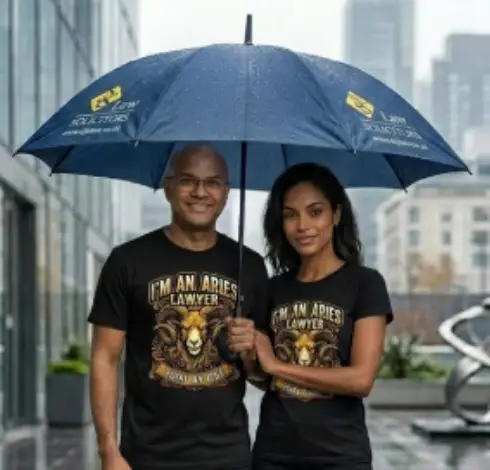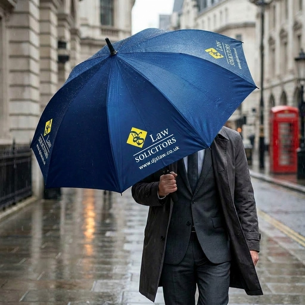 Prominently branded with the DJS Law logo and website across the canopy, this umbrella does more than keep you dry. It carries a name that stands for expertise, integrity, and professionalism — wherever you take it. From the streets of the City to the steps of the courthouse, it turns heads for all the right reasons.