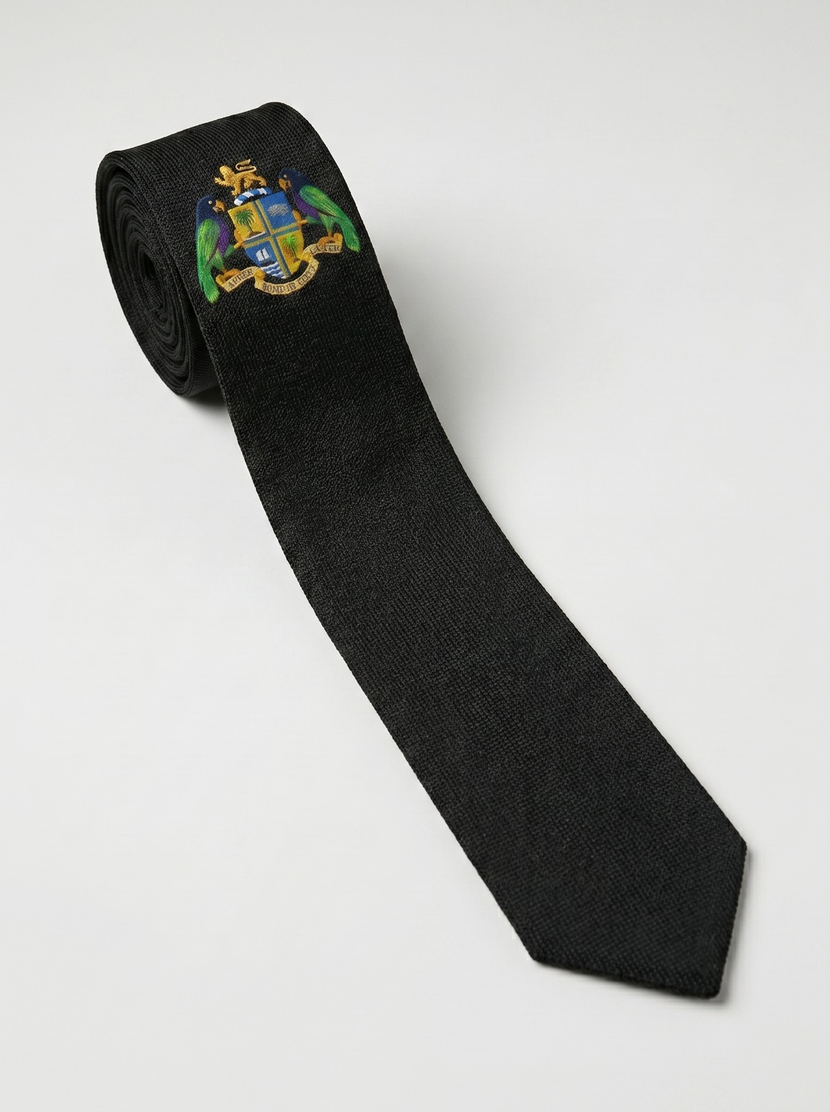 Deep black fabric with full colour Dominican Coat of Arms. Slim professional cut. Suitable for all formal occasions. Ideal gift for lawyers, legal professionals, and those with Caribbean heritage.