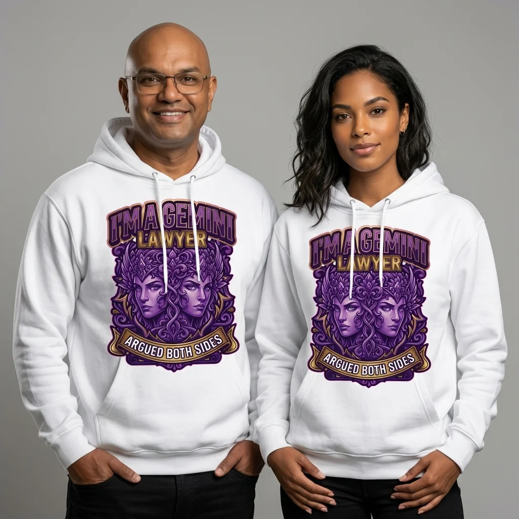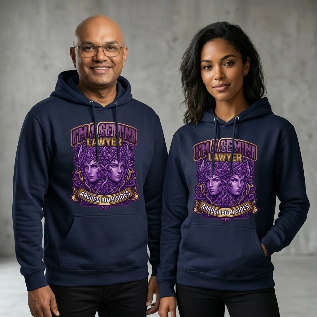 Bold unisex Gemini Lawyer pullover hoodie featuring a striking purple and gold twin faces graphic with the motto “Argued Both Sides”. Available in black, navy, and white. Perfect gift for Gemini legal professionals and astrology fans. Dispatched quickly from the UK.