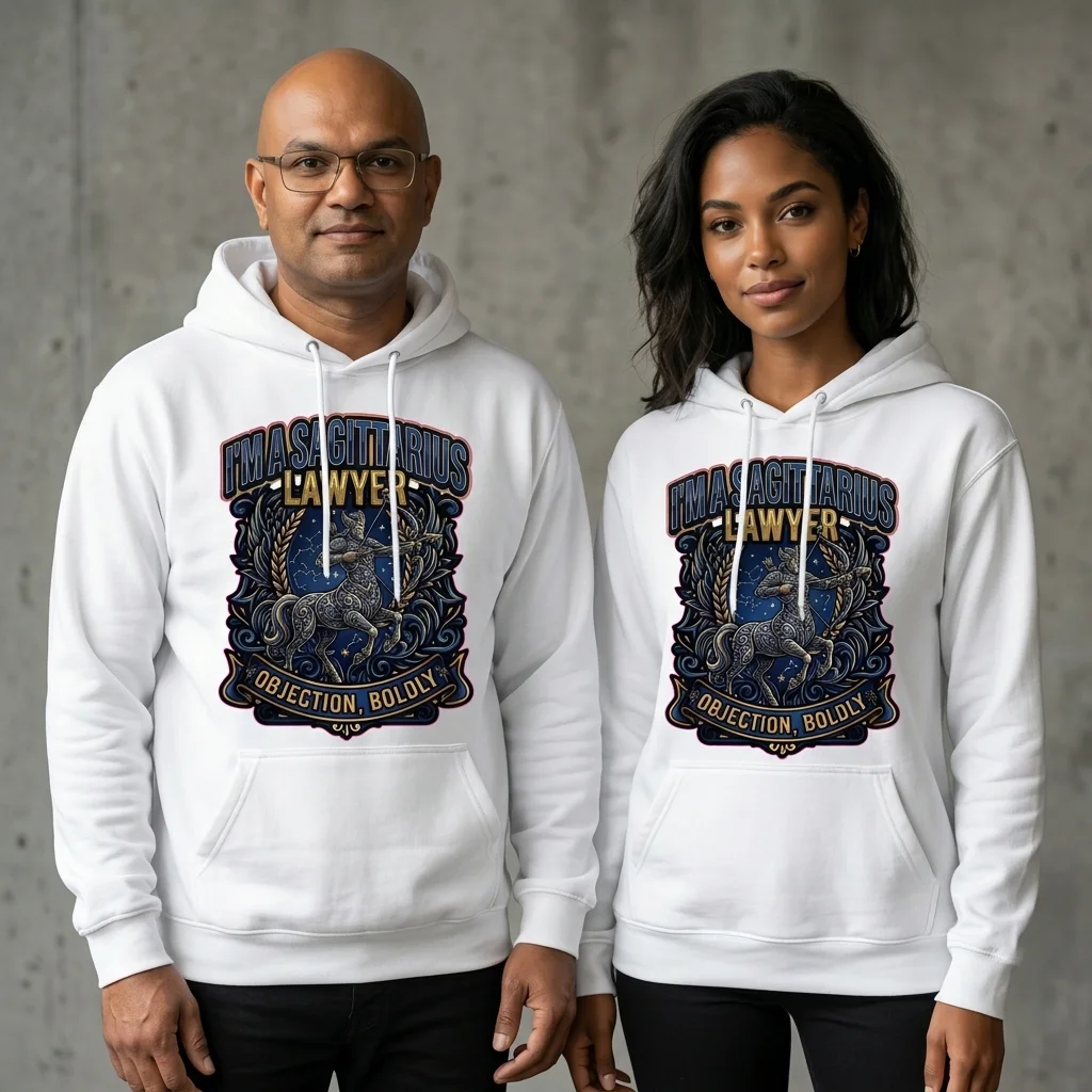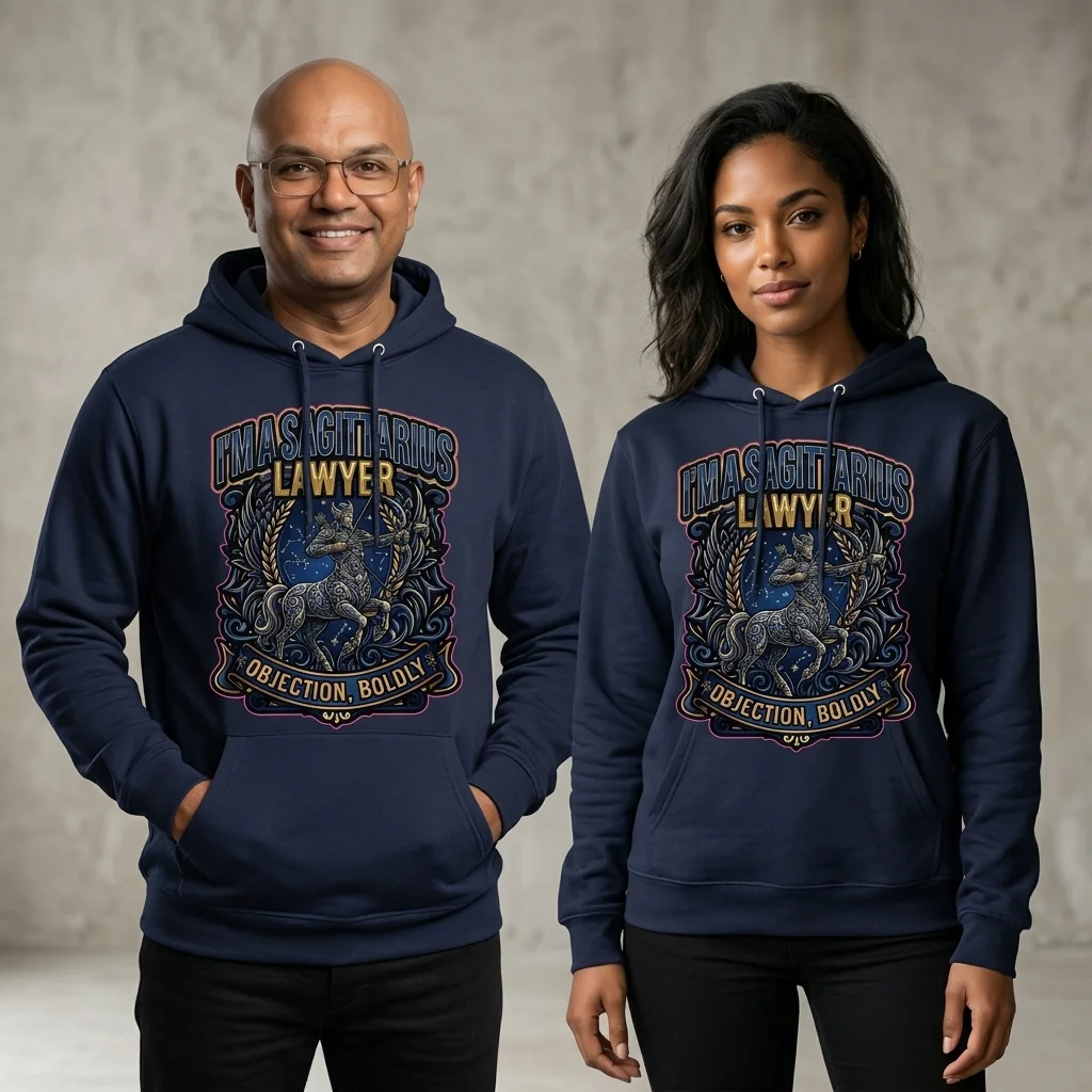 Show the world exactly who you are with this bold, eye-catching Sagittarius Lawyer pullover hoodie. Featuring a striking ornate centaur archer design in deep navy blue and gold tones set against a starry sky, paired with the motto “Objection, Boldly”, this hoodie is the perfect statement piece for any Sagittarius who works in law — or simply wants the world to know it.